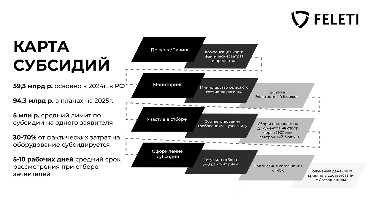 Партнёры и клиенты компании FELETI в полном праве могут рассчитывать на предоставление госсубсидий в размере от 30 до 70% стоимости приобретаемого оборудования.